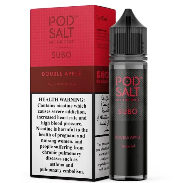 A refreshing Pod Salt Subo Double Apple 3mg/50ml flavored nicotine e-liquid made for a glacial vaping experience.